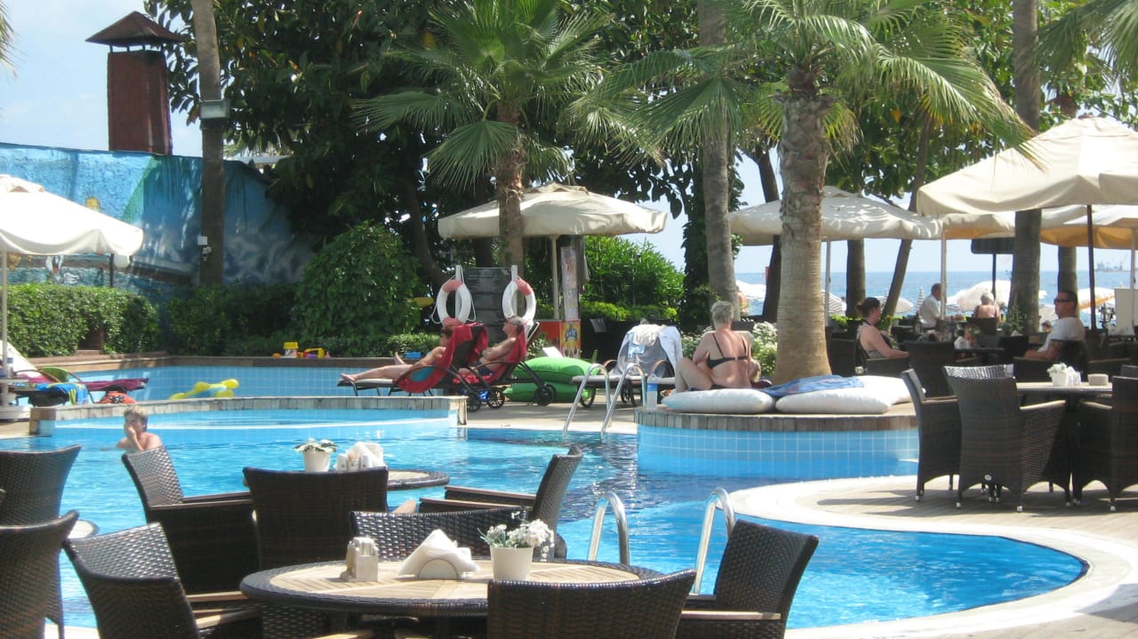 Poolanlage dahinter Strand