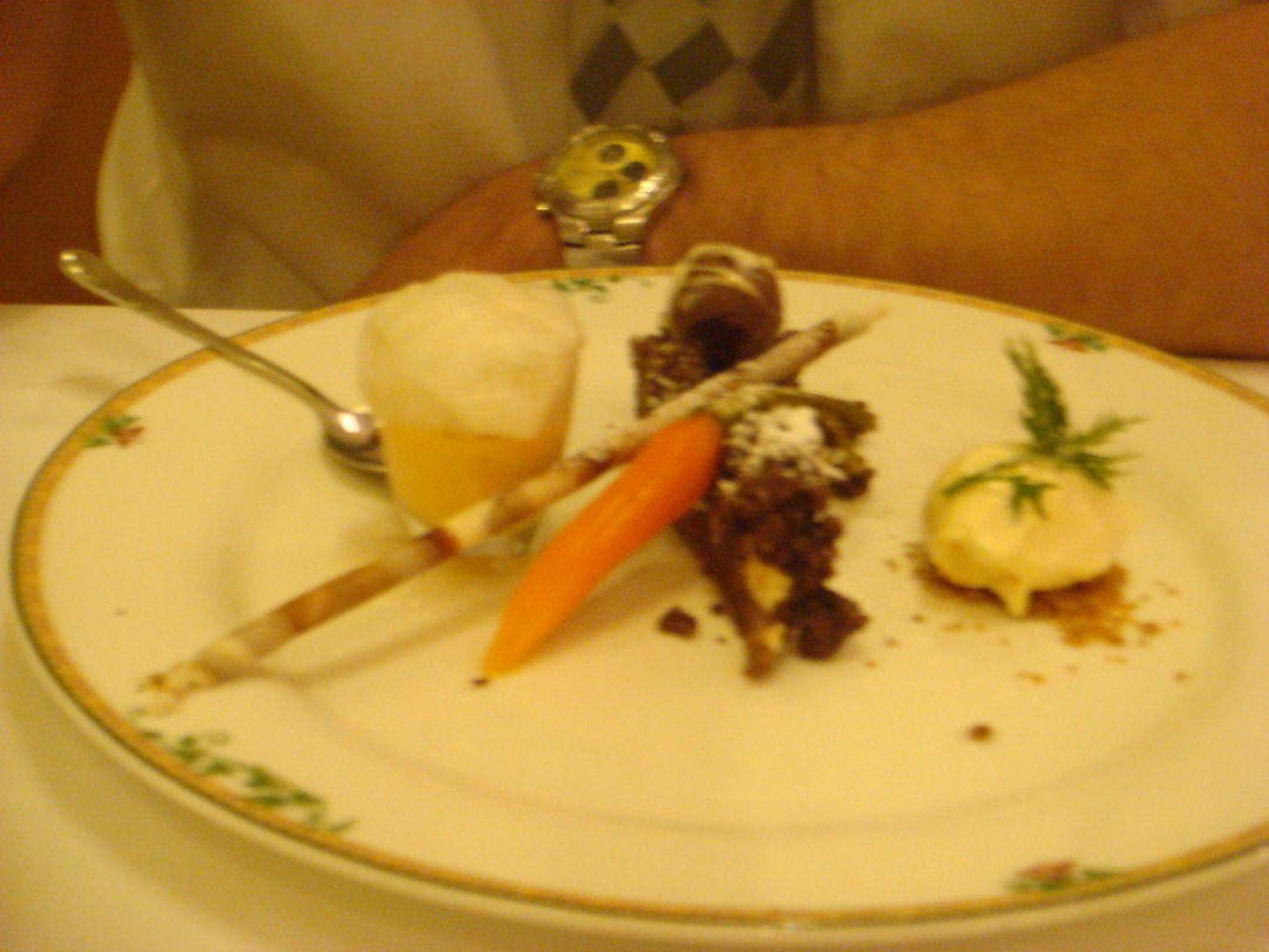 Valrhona Schokolade mit Karottencreme, Ziegenmilcheis und Wacholder