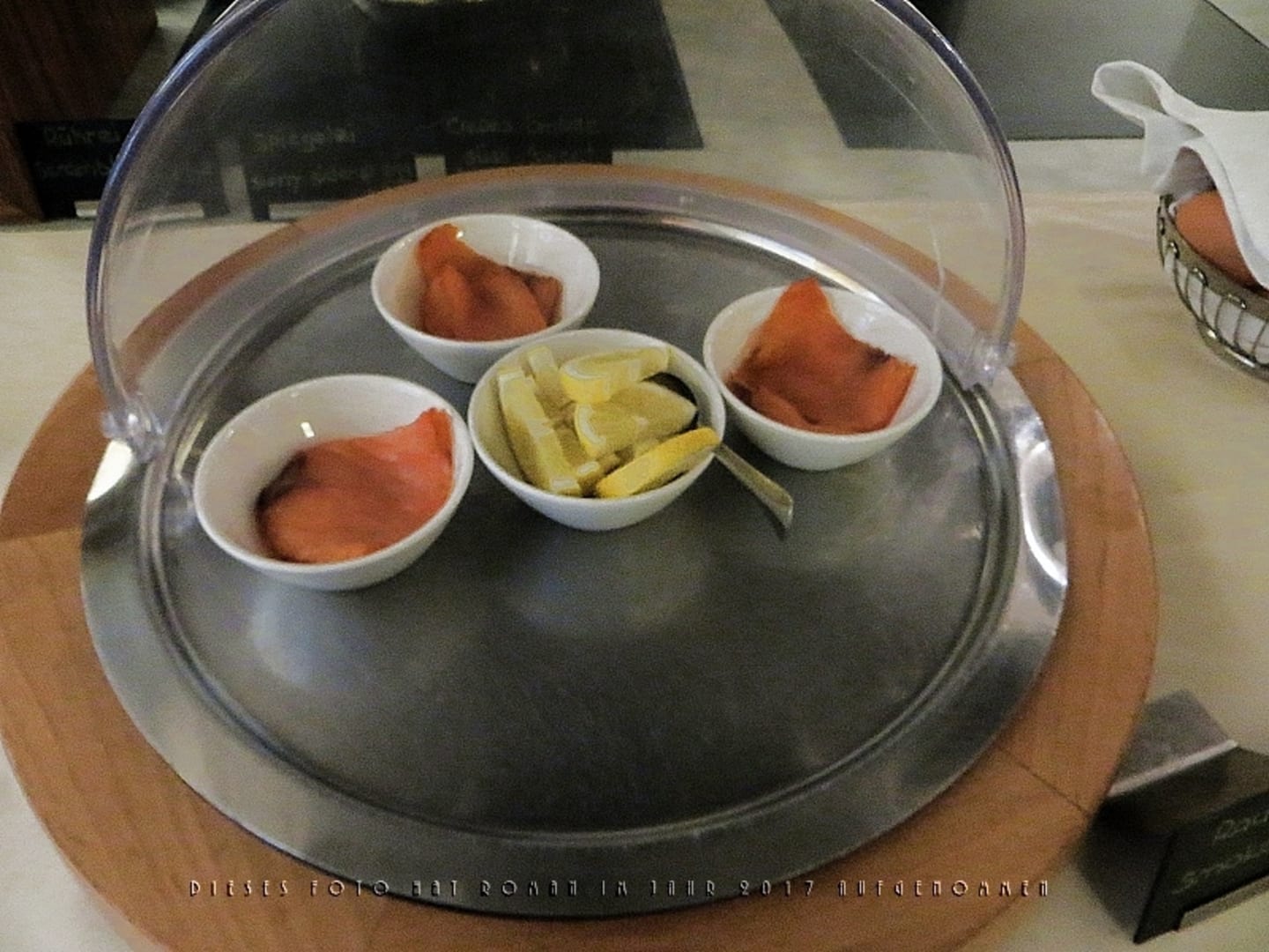 GastroDie Präsentation von Lachsscheiben und Zitronenscheiben auf dem Tisch, auf dem auch die Konfitüregläser stehen.