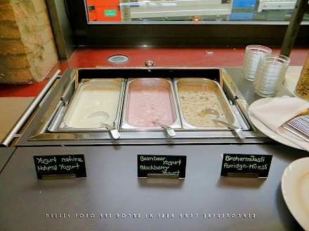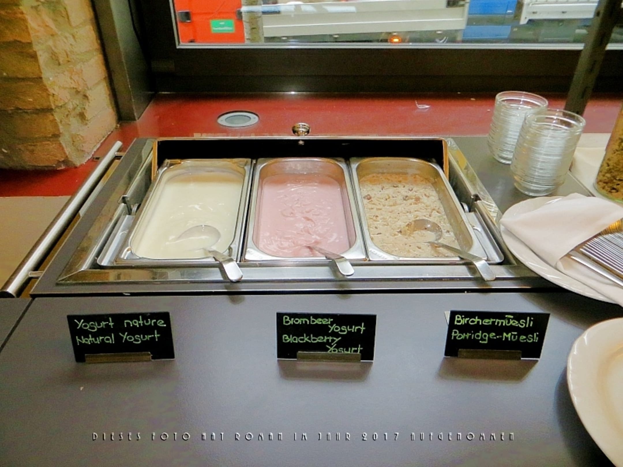 Der geöffnete Warmhaltekasten, in dem hier nicht Rührei oder Würstchen, sondern Naturjohurt, Brombeerjoghurt und Bircher Müsli zur Auswahl stehen. Rechts die Löffel, gut geschützt, indem nur die Stile freiliegen.