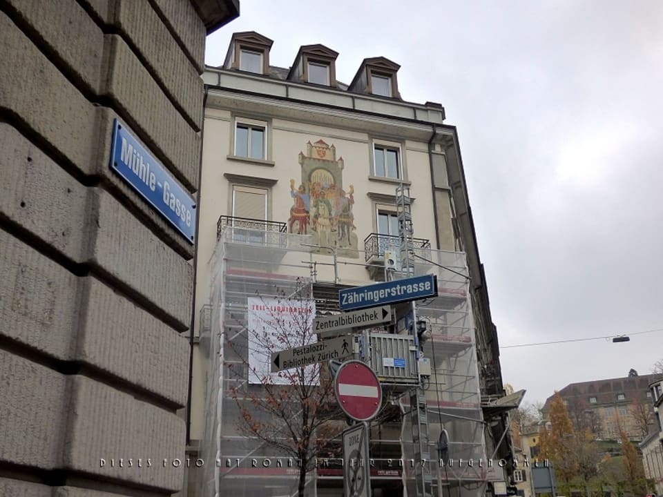 Die Außenansicht von der Mühlegasse aus, wenn man von der Limnat her zum Hotel geht. Während der Umbauphase ist die Fassade des Hotel Scheuble leider nicht in voller Schönheit erkennbar.