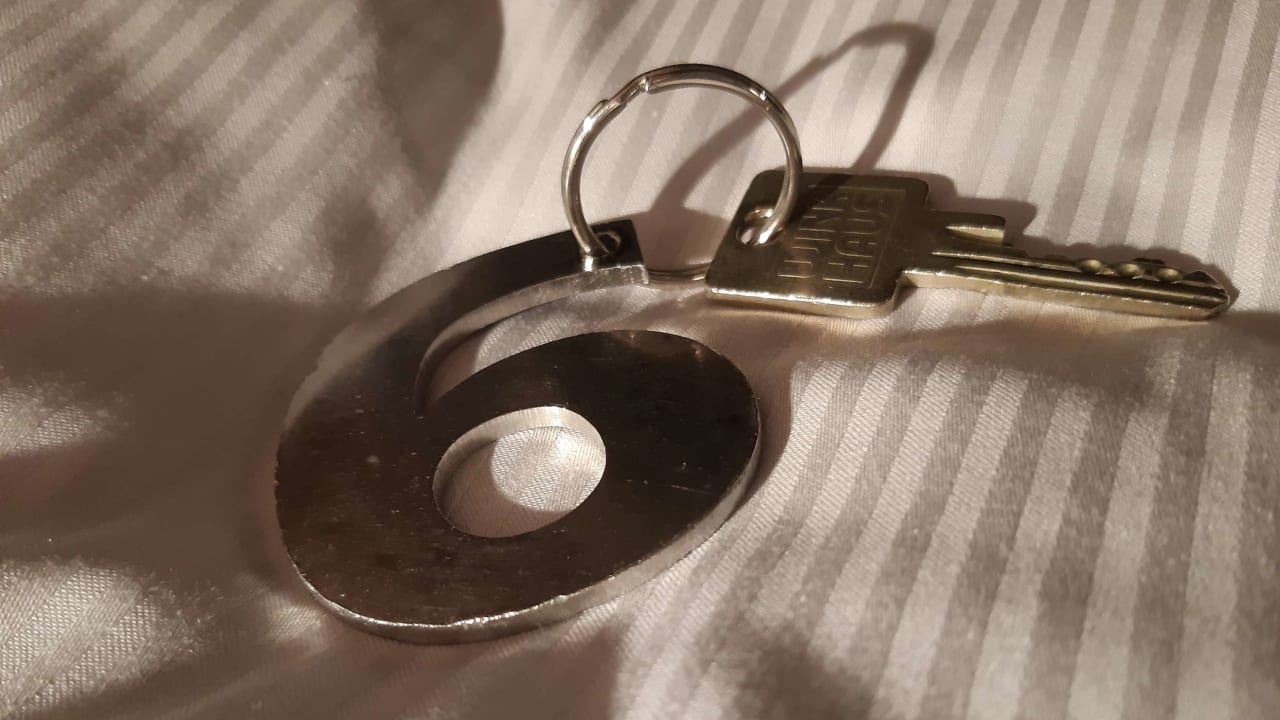 ZimmerSchlüssel für das Schneider-Zimmer: schiefstes Zimmer im schiefsten Hotel... Ca. 40 cm Höhenunterschied