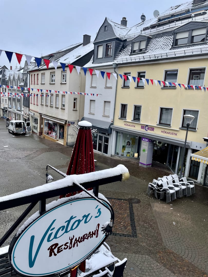 Ausblick vom Zimmer auf das Schild des Hotel-Restaurants und die Fußgängerzone