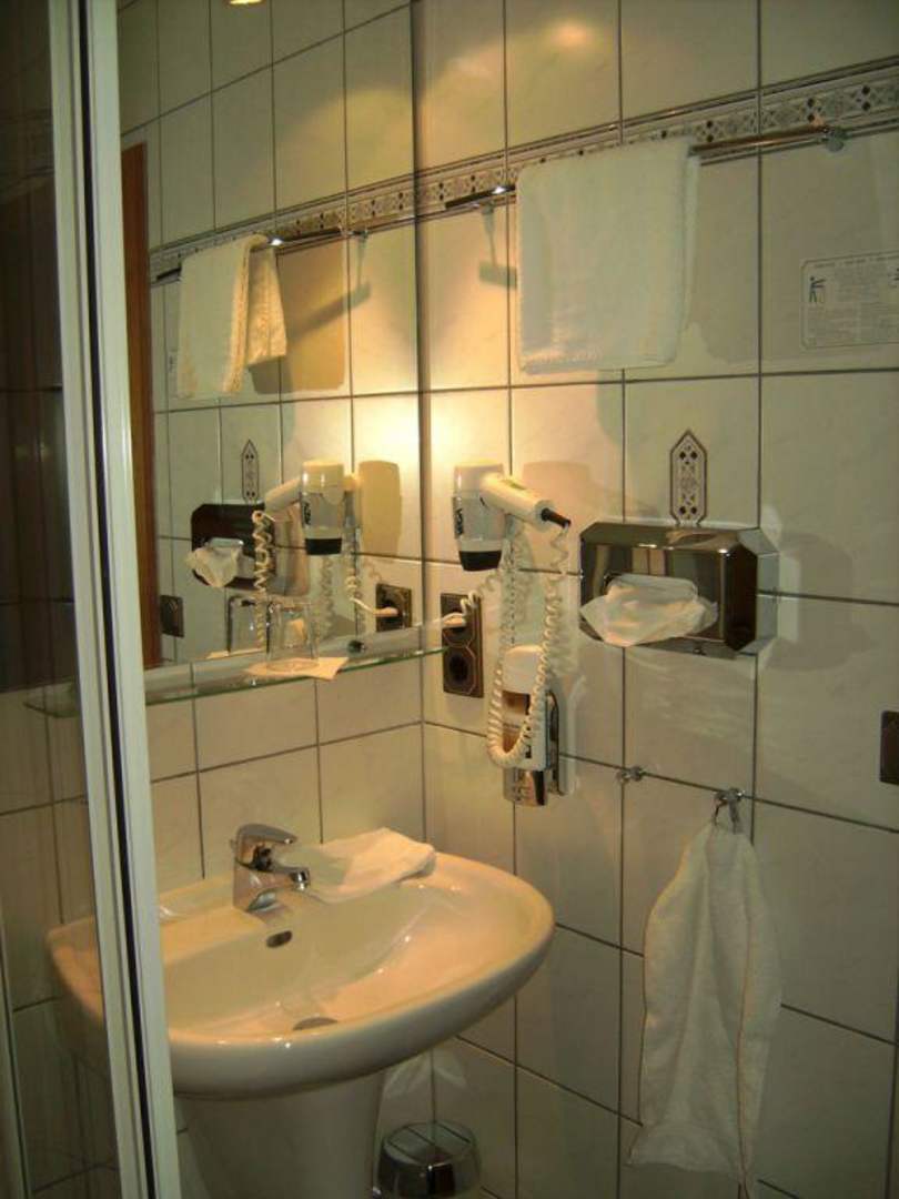 Bad mit Waschbecken, Spiegel, Fön