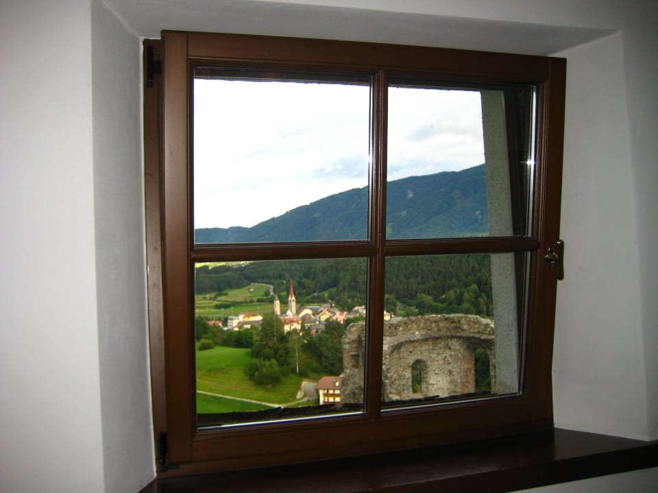 FensterblickBlick aus einem Flur des Schlosses auf eine Teil der Außenanlage & die Stadt Sankt Lorenzen im Pustertal