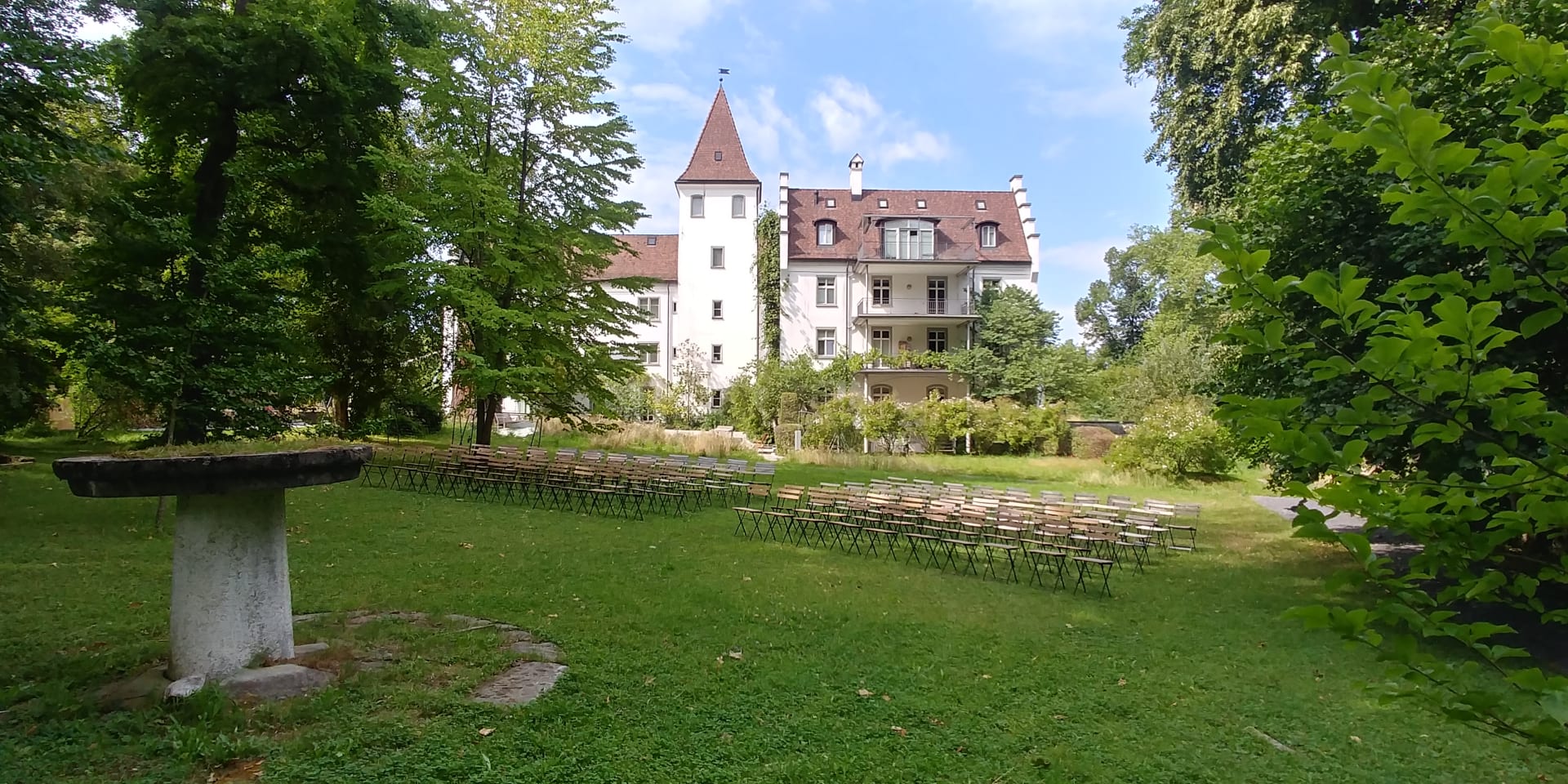 Blick vom Garten mit Konzertbestuhlung auf das Schloss