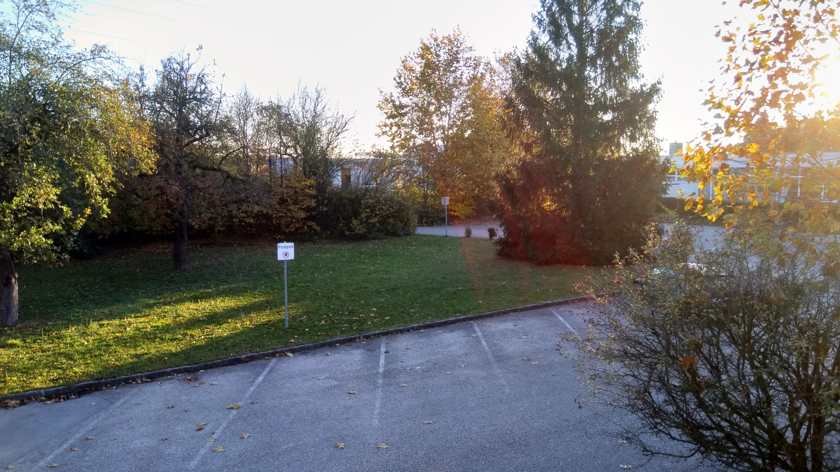 Ausblick vom Zimmer im Obergeschoß auf den großen Parkplatz.
