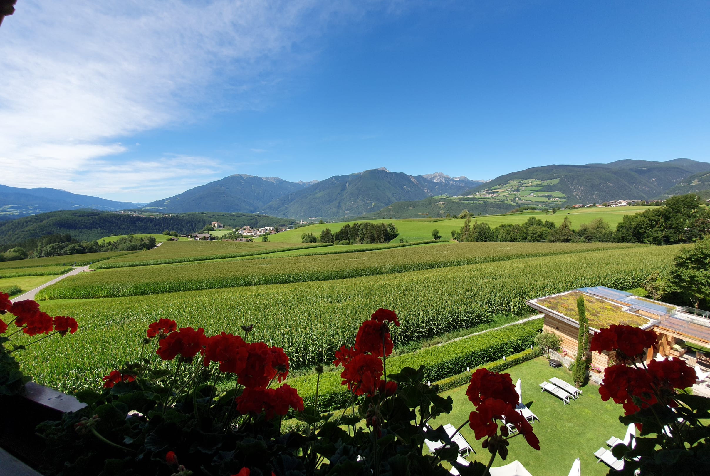 Blick vom Balkon ins Tal; auch die rodenecker Burg ist links zu sehen; rechts ist die Panorama-Sauna.