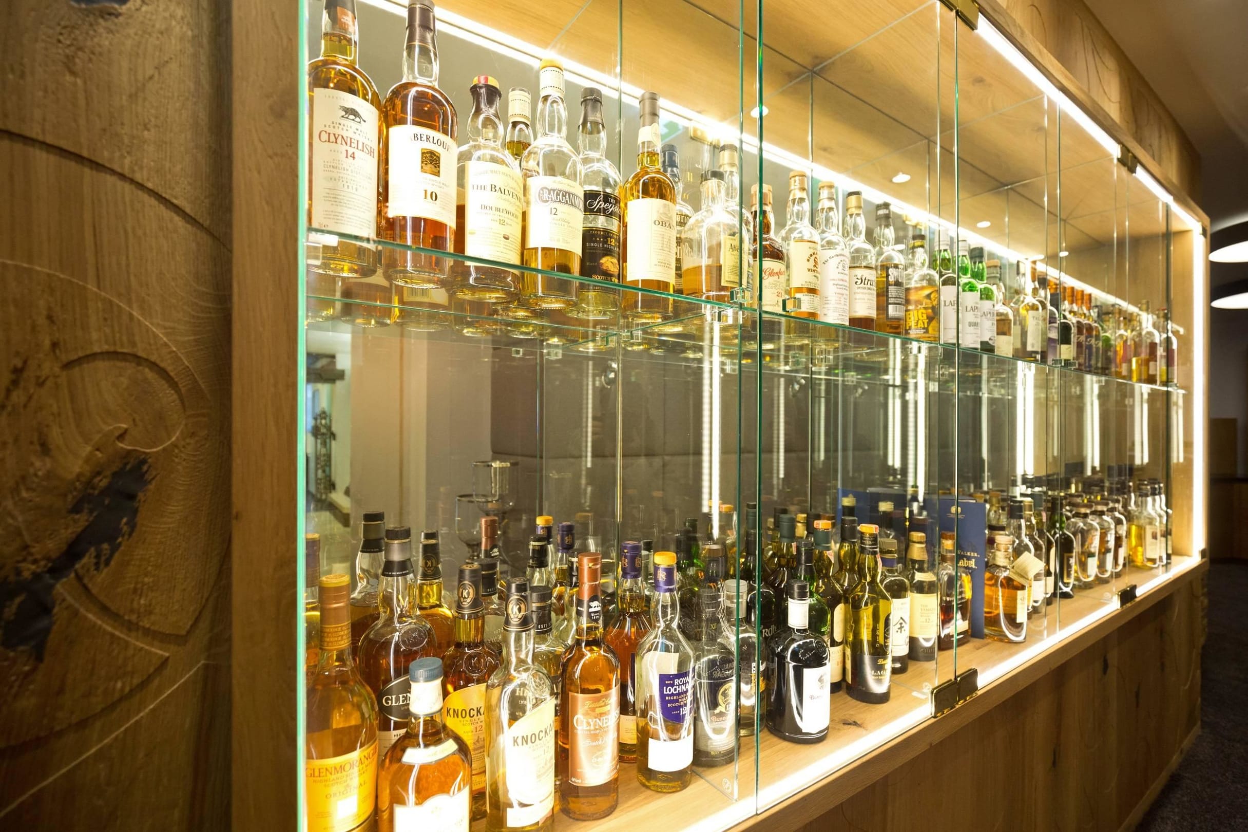 Die whiskyvitrine mit 100 verschiedenen Whiskies.