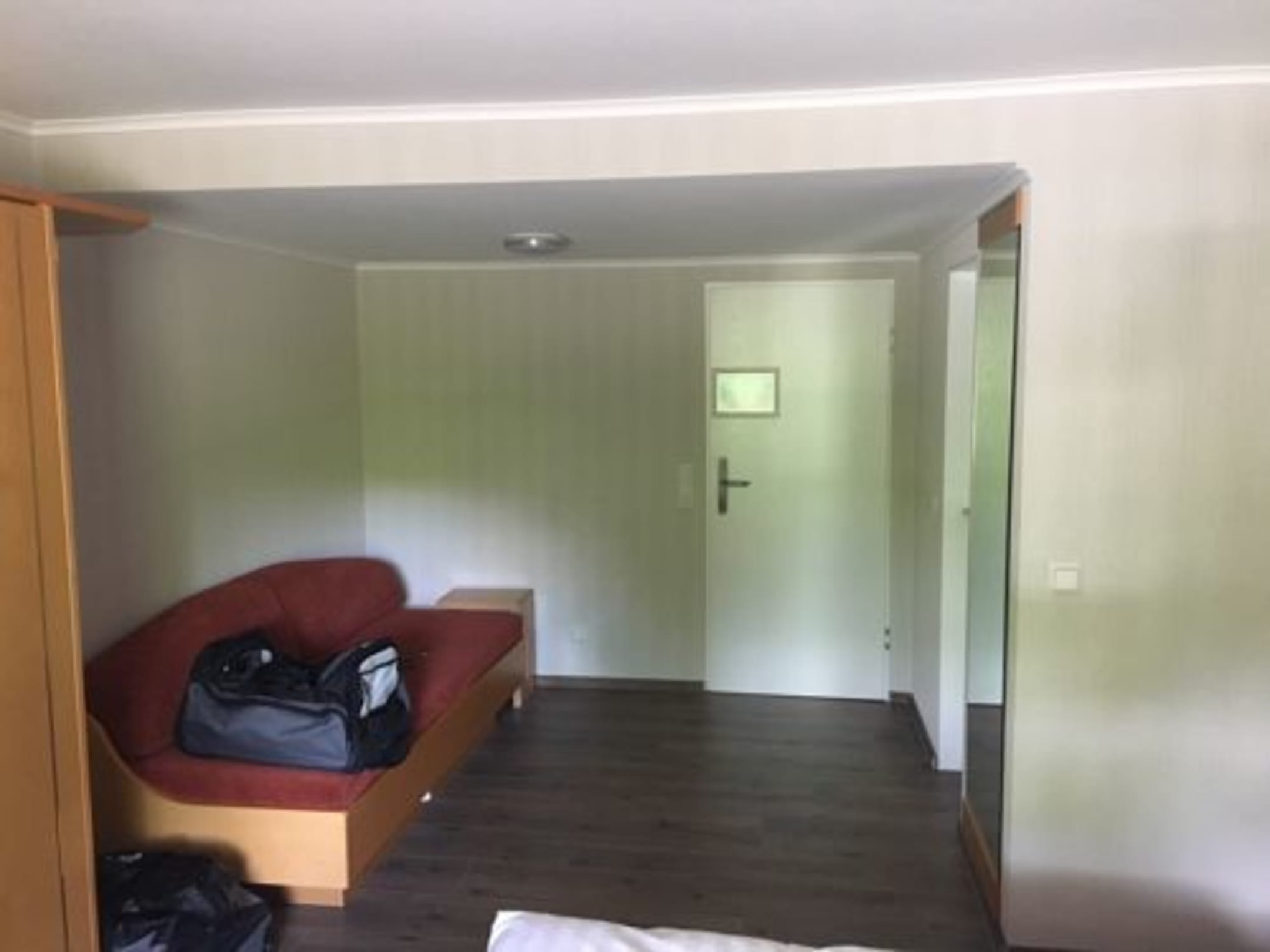 Decke sehr nieder. Möbel veraltet. Wirkt wie eine Abstellkammer. Zimmer sehr dunkel