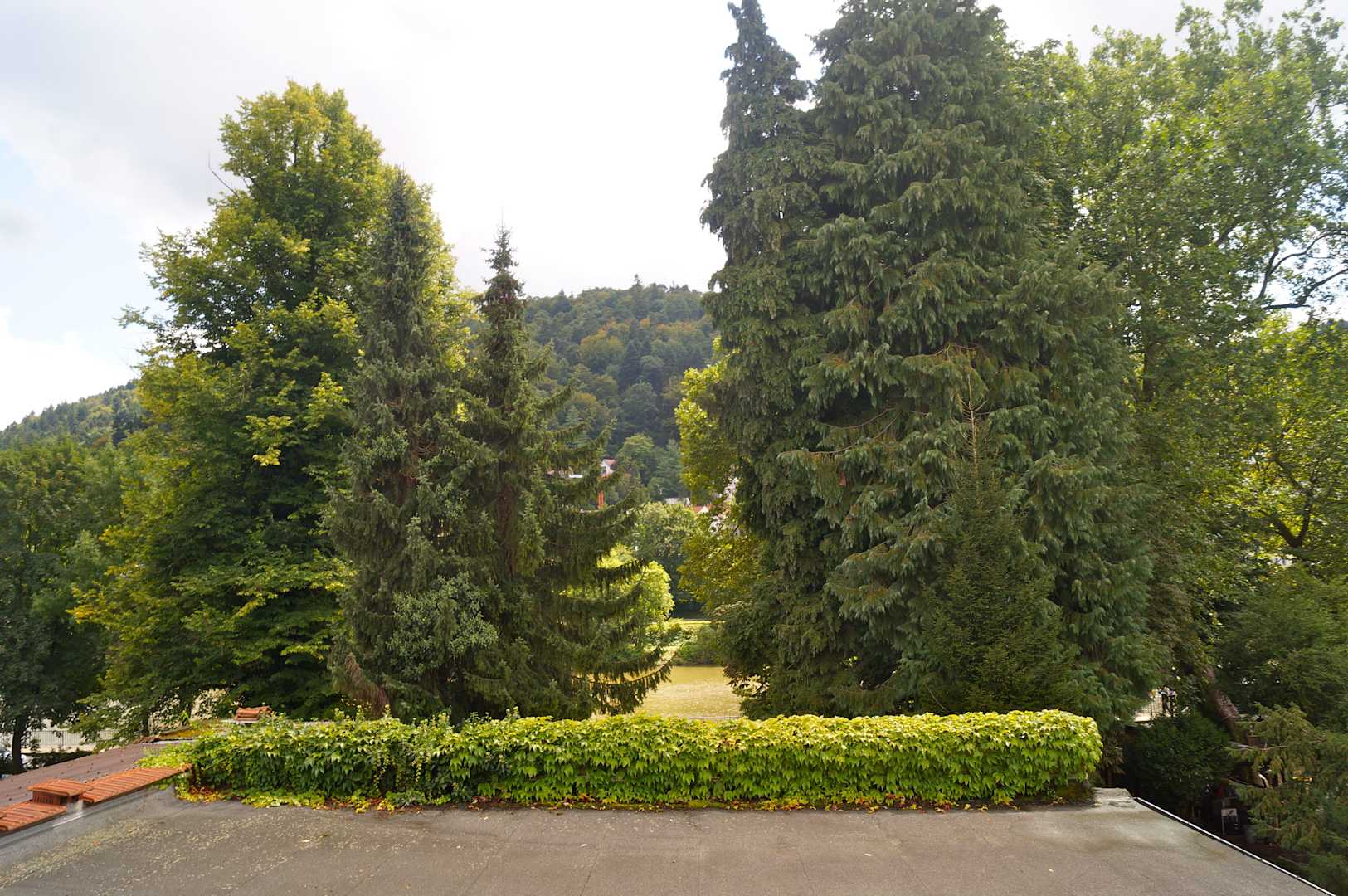 Blick vom Balkon über Biergarten zum Neckar