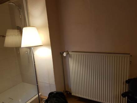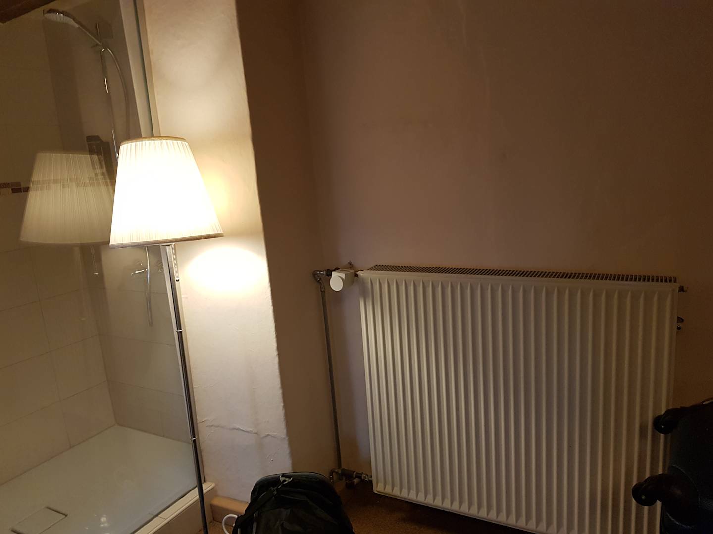 Die Dusche war im Zimmer mit Glasabtrennung. Es gab kein extra Bad, nur eine Toilette. Die Heizung war abgesperrt und konnte nicht selber reguliert werden