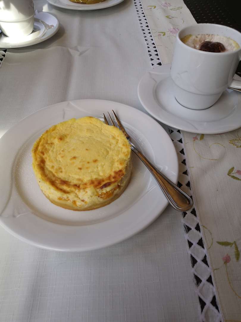 Käsekuchen und Kaffee auf derTerrasse.