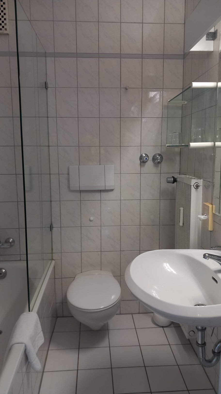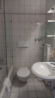 Das Bad ist sehr klein, Badewanne mit hohem Einstieg, Toilette und Waschbecken sind sehr niedrig gesetzt. Insgesamt ist das Bad nicht mehr zeitgemäß.
