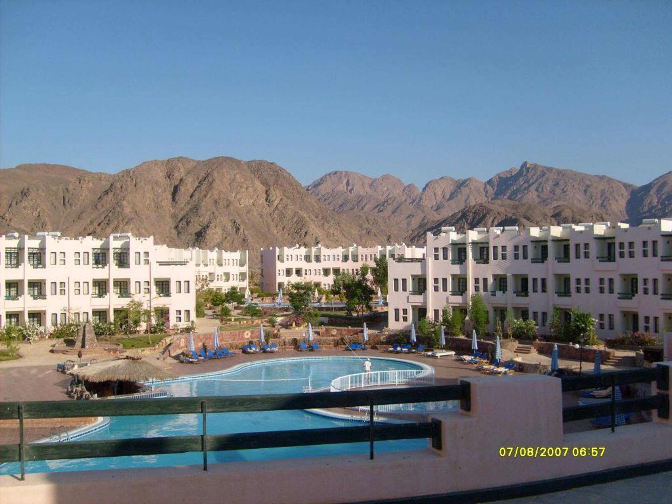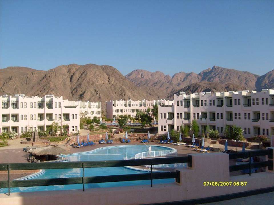 Hotel soly mar sea star w tabie/egiptWidok z tarasu frontowego budynku na basen oraz zabudowania z pokojami. W tle Góry Synaj.