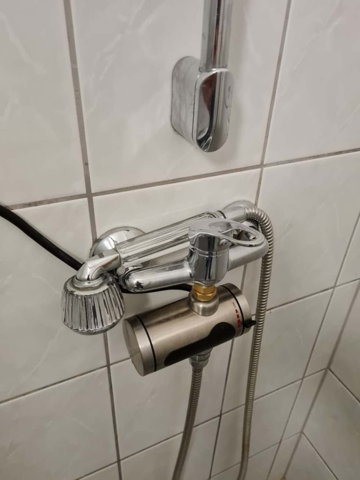 ZimmerDuschkopf, welcher nicht eingehangen werden kann. Mit einem kläglichen Rinnsal lauwarmen Wassers.