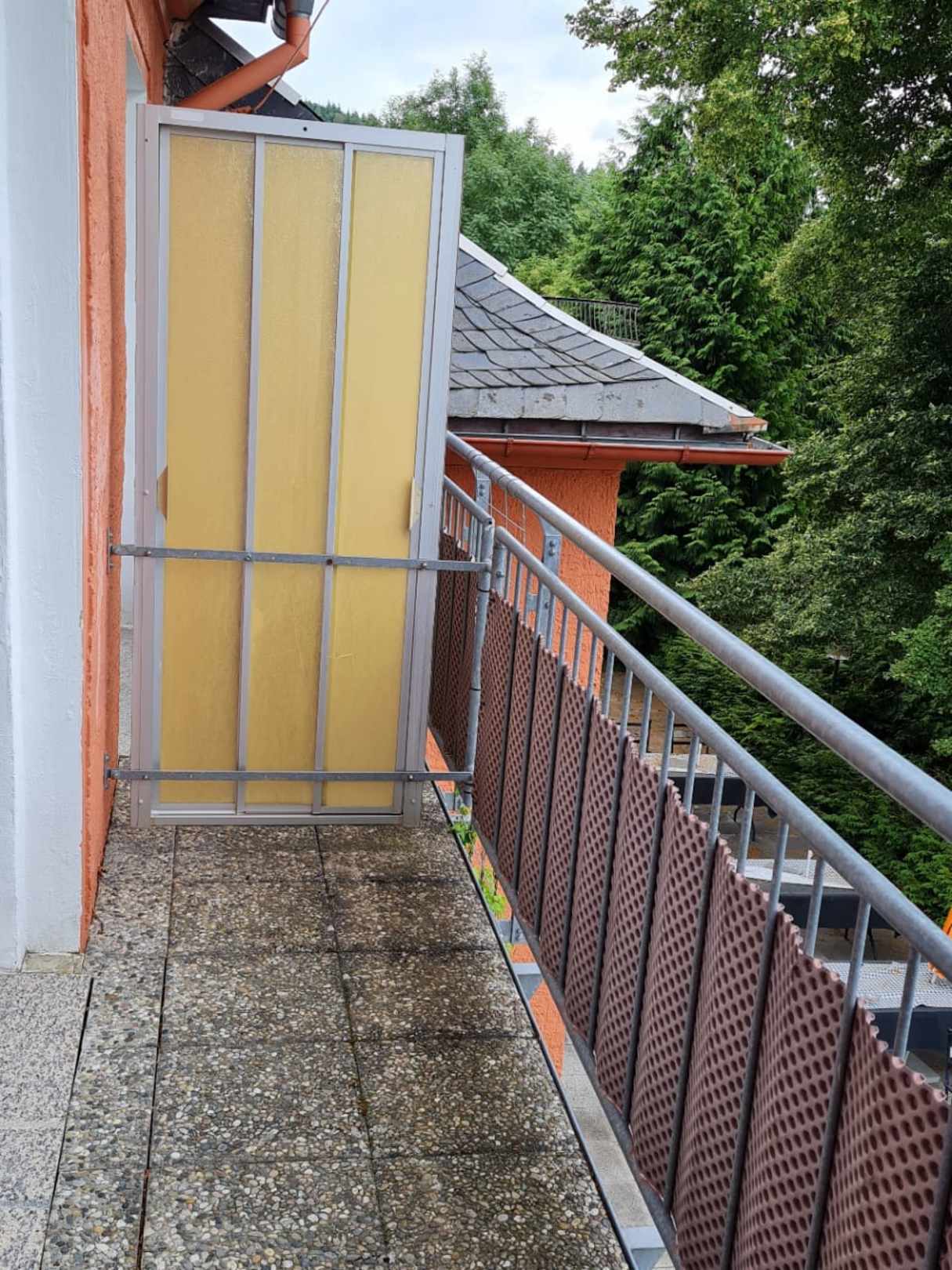 Balkon mit Sichtschutz aus alten Duschtüren und einer Noppenbahn am Geländer.