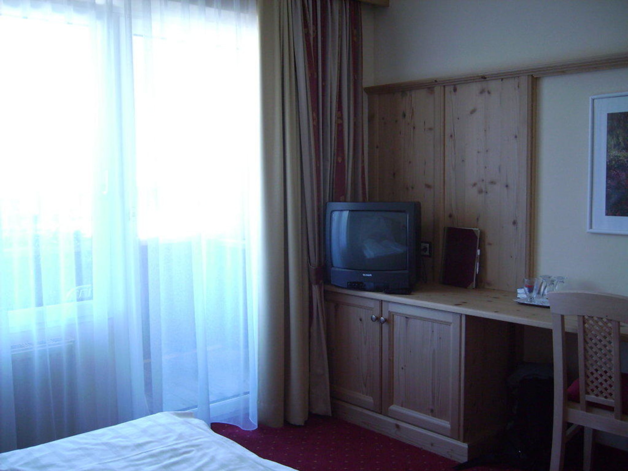 von links Balkontür, Fernseher, Minibar