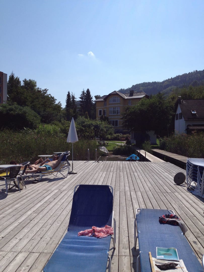 Blick vom Badesteg auf das Hotel