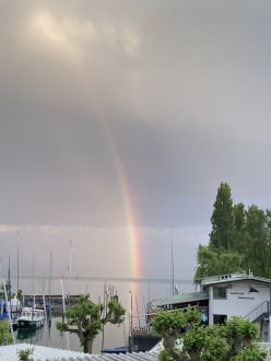 Blick vom Balkon auf den See mit Regenbogen
