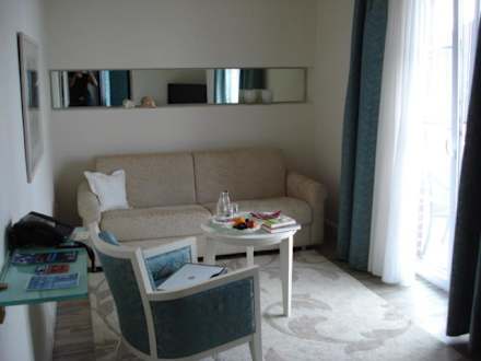 Wohnzimmer Suite TürkisBlick vom Flur in das Wohnzimmer. Rechts (nicht im Bild) kleines Sideboard mit Flachbildschirm und Kaffeemaschine.