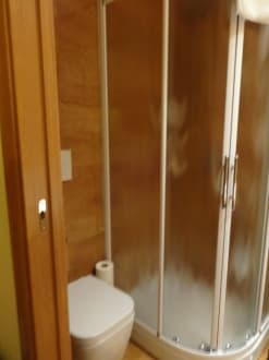 Kleine Dusche, nebenan Toilette.