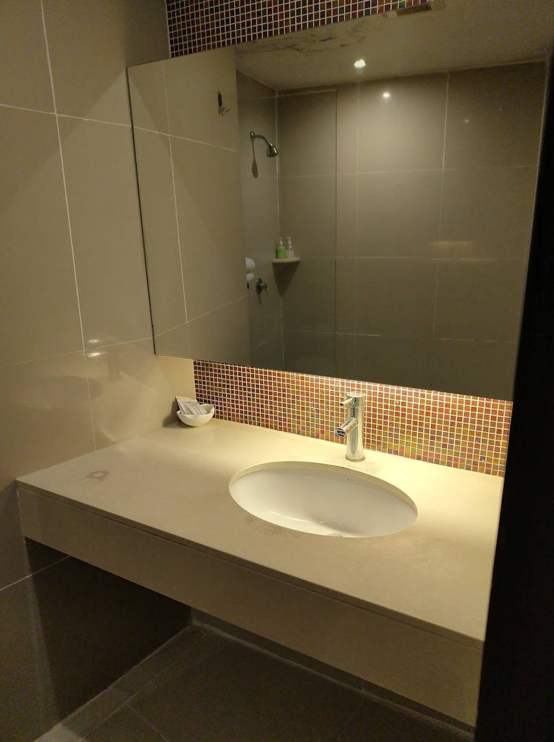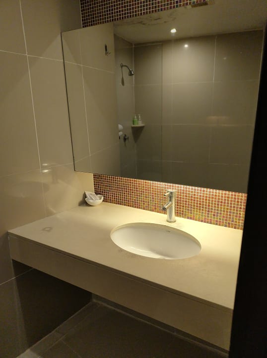Sehr großer Spiegel über dem Waschbecken.
