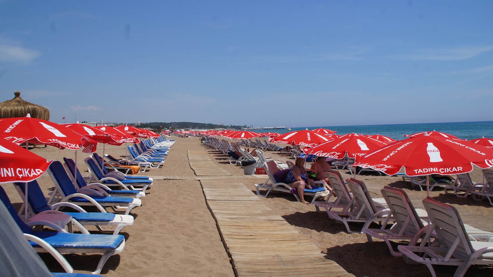 Saubere und intakte Liegen und Schirme (kostenlos). Guter Service am Strand.