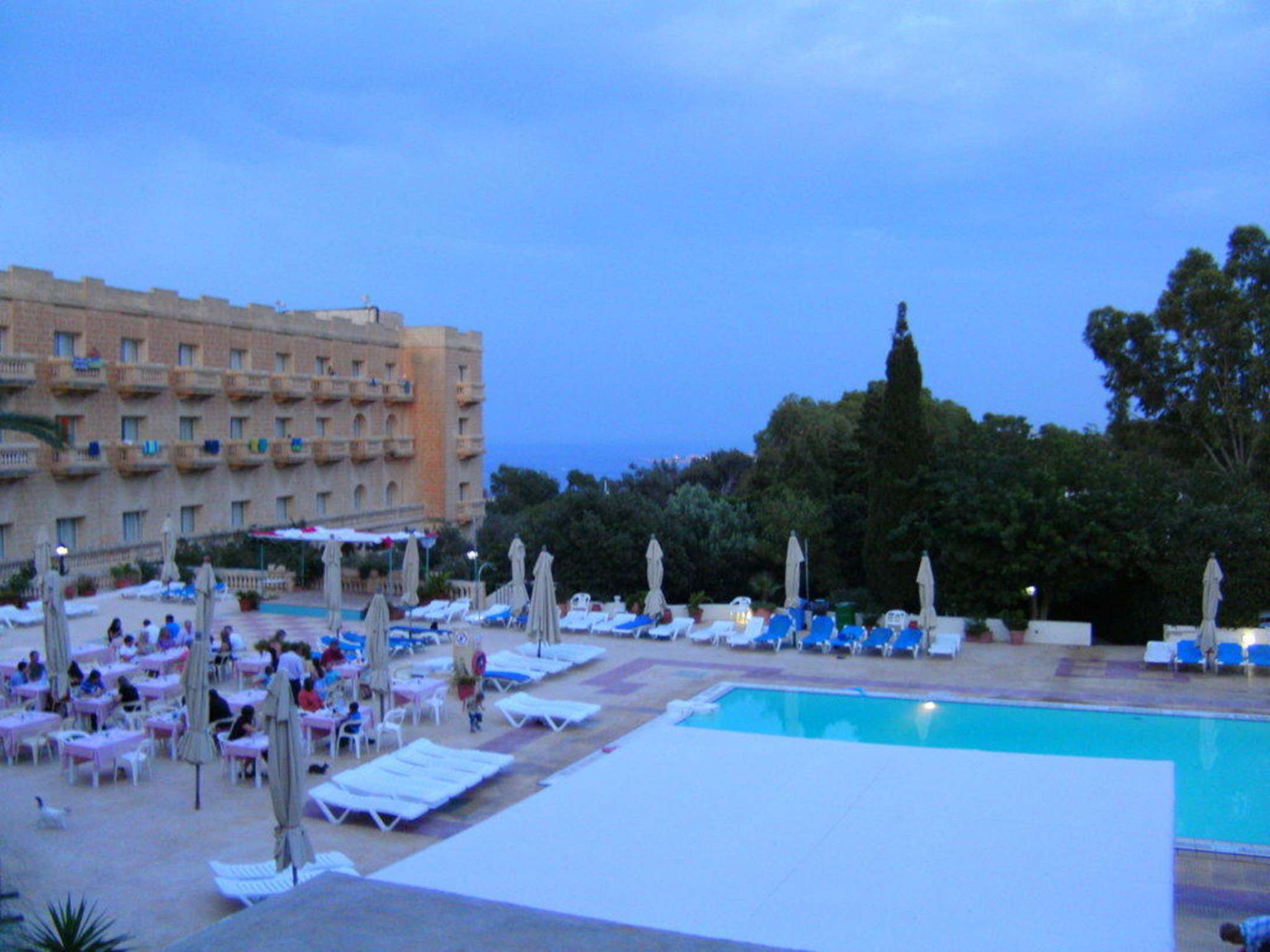 Zimmerausblick am Abend. Im Hintergrund schwach zu erkennen das Meer. Pool war ganz ok, aber kein moderner Standard. Am Eingangsbereich des Pools sind viel genutzte Wasserballtore aufgestellt --> unangenehm.