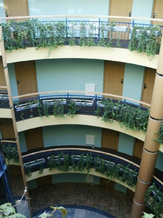 links die Spiegelwand ist der Fahrstuhl, vom umlaufenden Gang geht es zu den einzelnen Zimmern - das Bild stammt aus 2004 - inzwischen sind die Grünpflanzen (Efeu) viel grösser und mächtiger