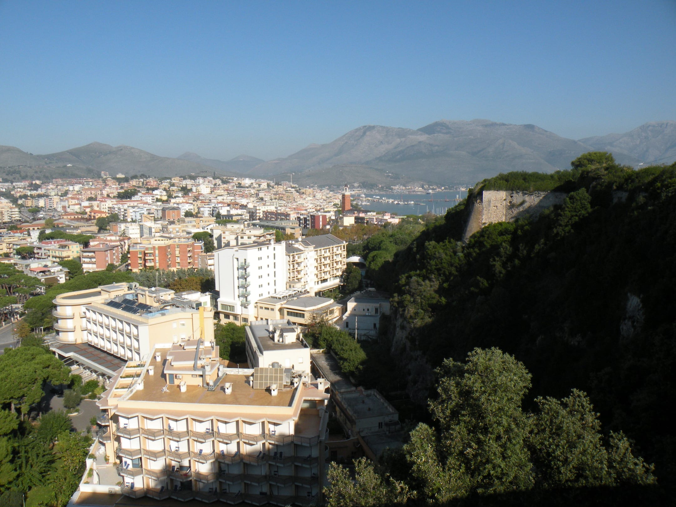 Beim Aufstieg auf den Monte Orlando sieht man gleich zu Beginn auf das Hotel (links im Vordergrund) und später auf den Strand vor dem Hotel, es ist eine Steiküste, deshalb die wechselnde Sicht