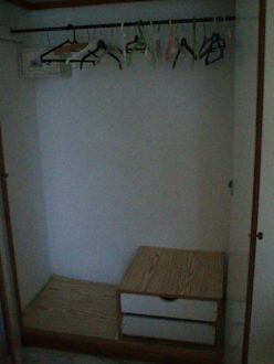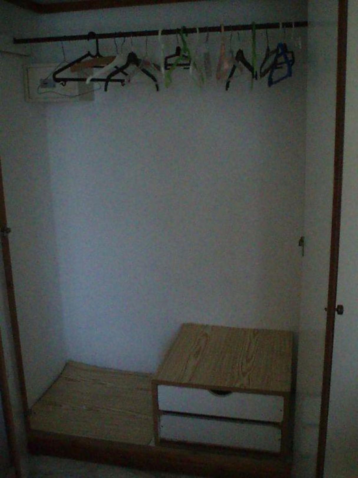 KleiderschrankFür einen längeren Aufenthalt sehr unpraktisch, da keine Einlegeböden vorhanden sind.
