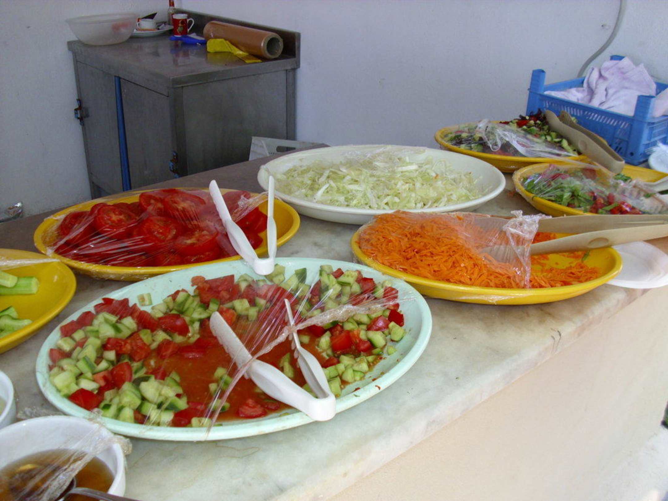 Salate Obst StrandbarSalate sowie Obst (Äpfel, Birnen Nektarinen Wasser und Honigmelone, Weintrauben)