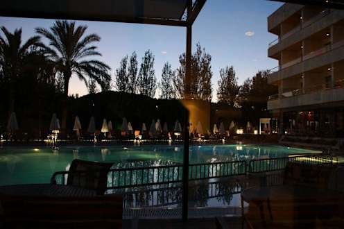 Pool bei Abenddämmerung vom Speisesaal aus