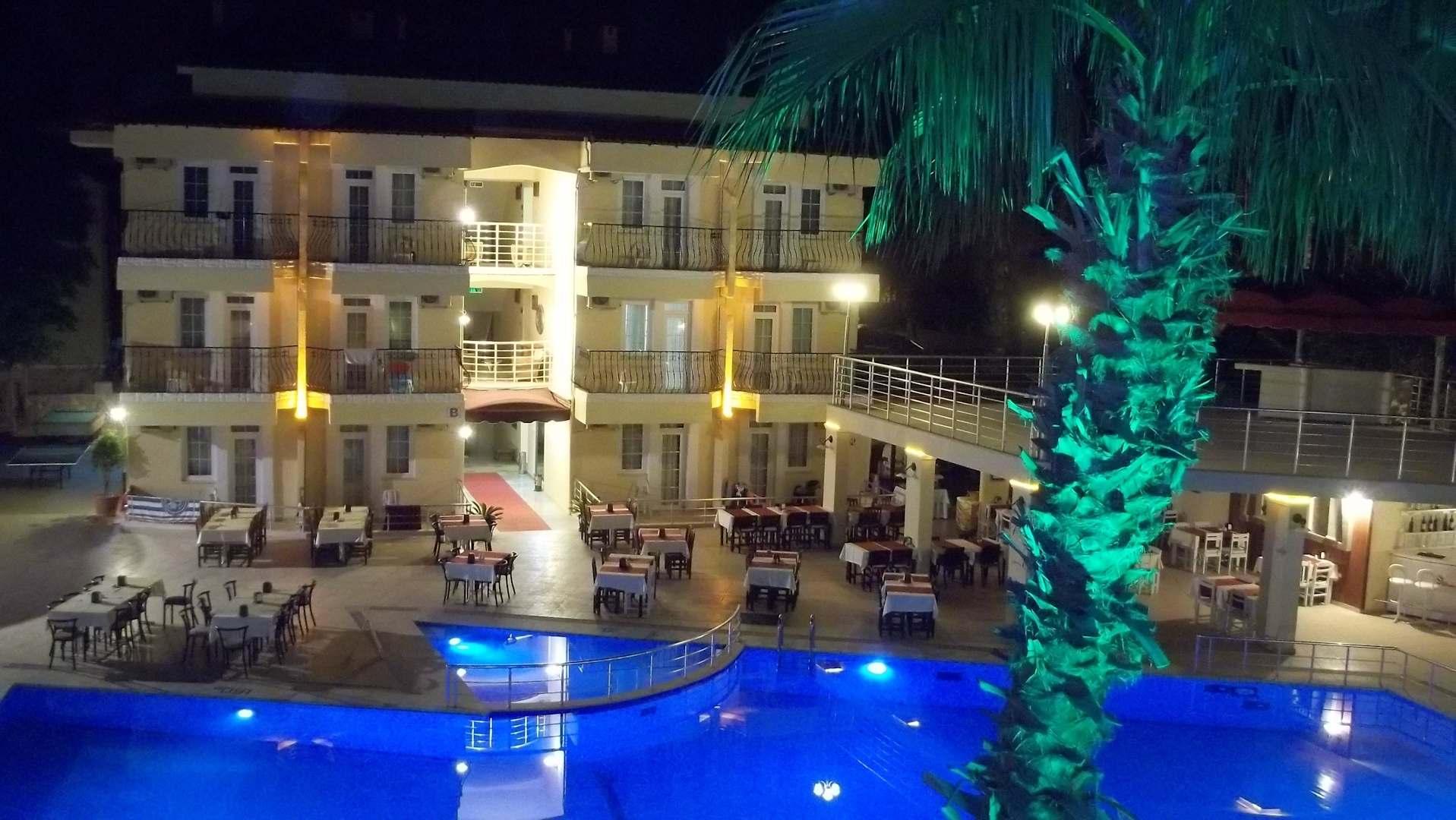 Blick vom Balkon auf Pool & Open-Air Restaurant