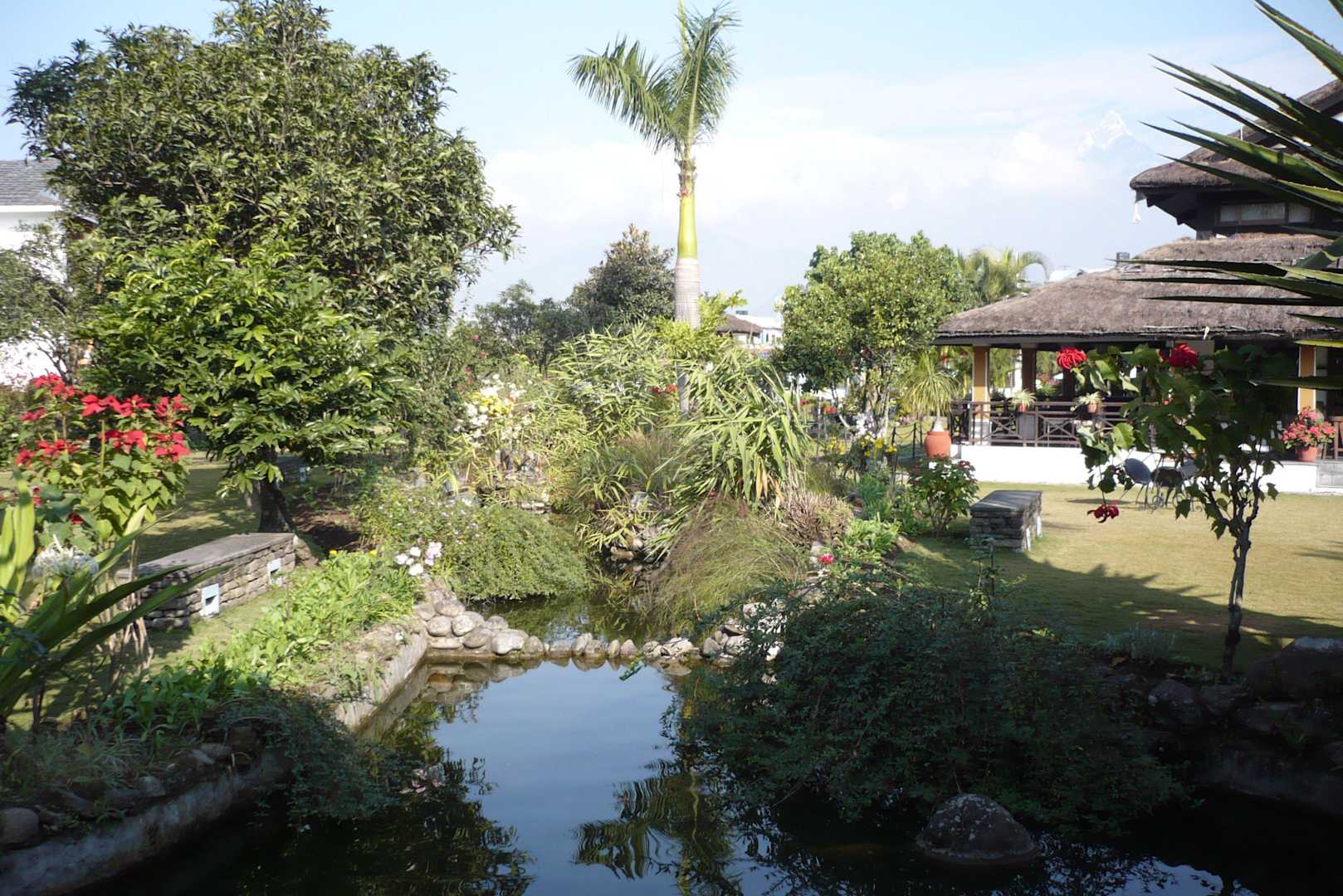 Kleine Teiche mit Zierfischen durchziehen die Anlage. Von kleinen Brücken und Übergängen kann man auf die Fische und Pflanzen im Teich schauen und verweilen.