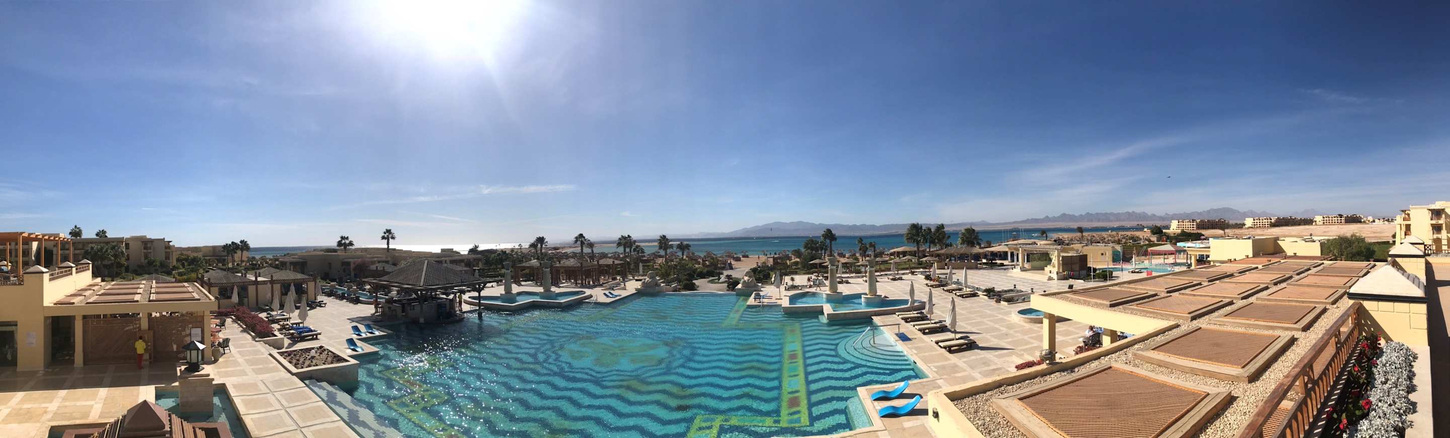 Anblick vom Cafe auf die Poollandschaft (Beheizter Pool! Hatte immer 29 Gad!!!)