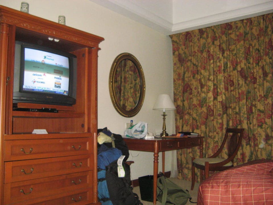 Blick von Bett auf Tisch und TV