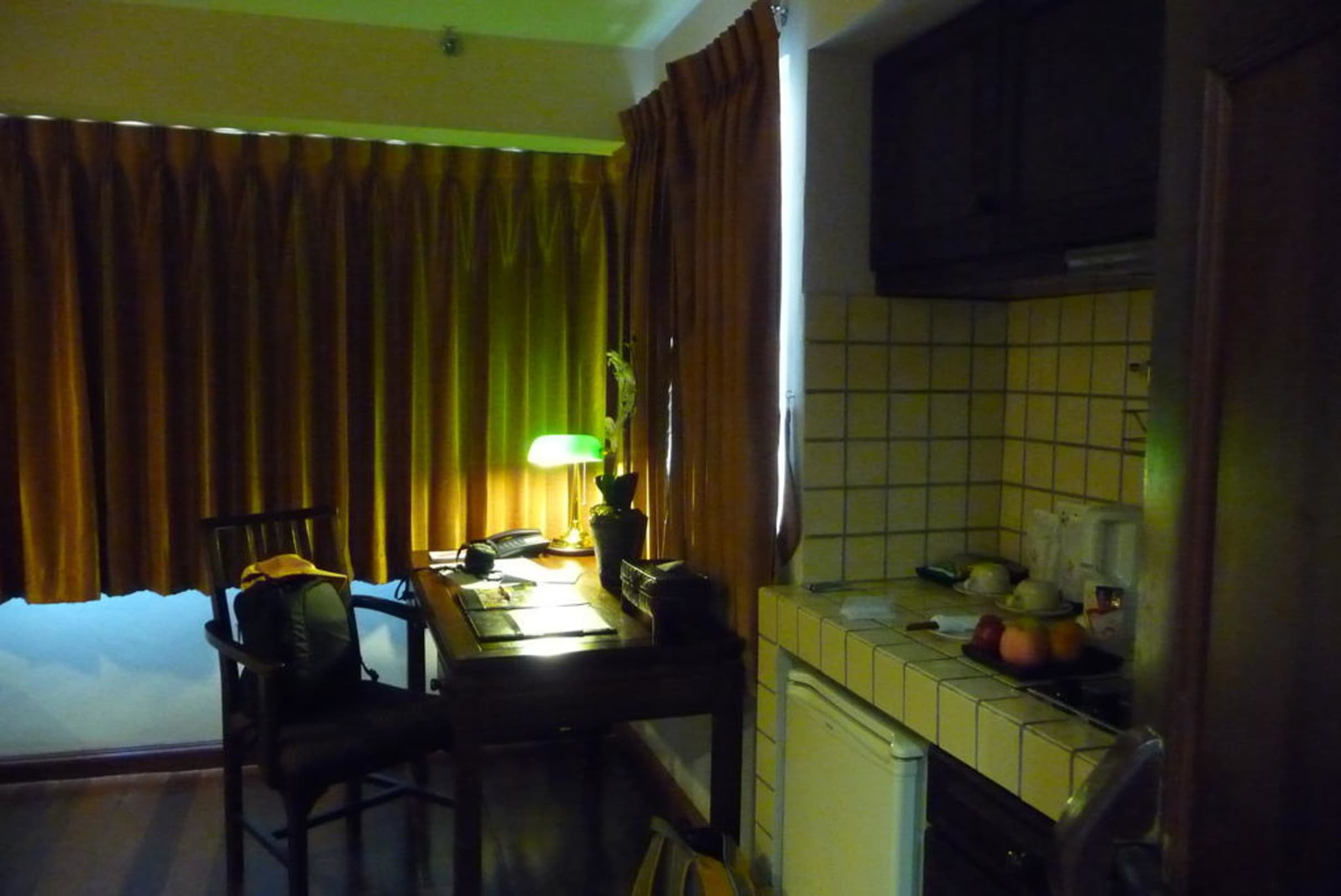 Küchenzeile und Schreibtisch mit BeleuchtungAuf dem Schreibtisch findet man Infomaterial und Speisenkarte.