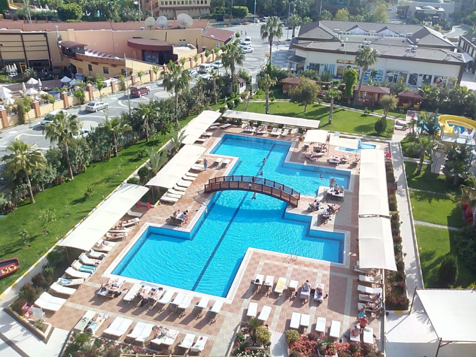 Blick auf Pool und Gartenanlage