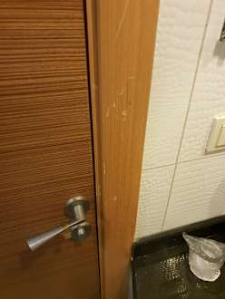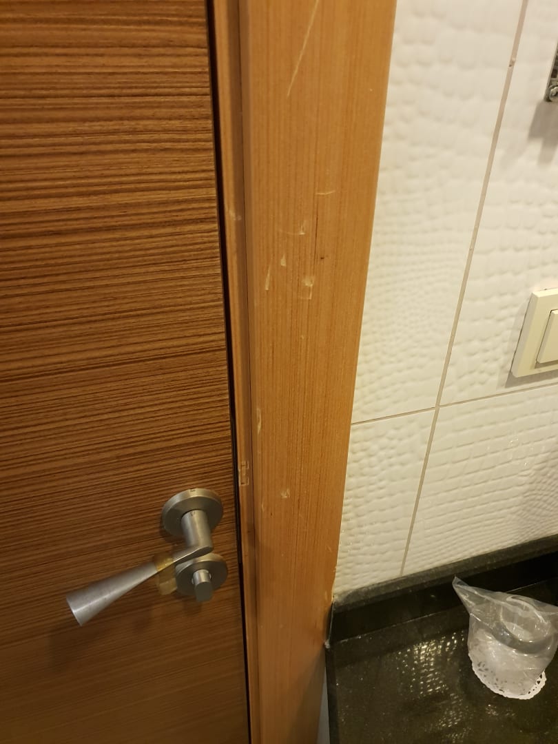Badezimmertür ist verkratzt.