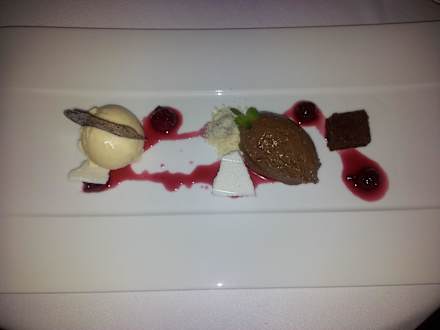 Mousse, Edelschokolade,Mandeleis,Kirschragout