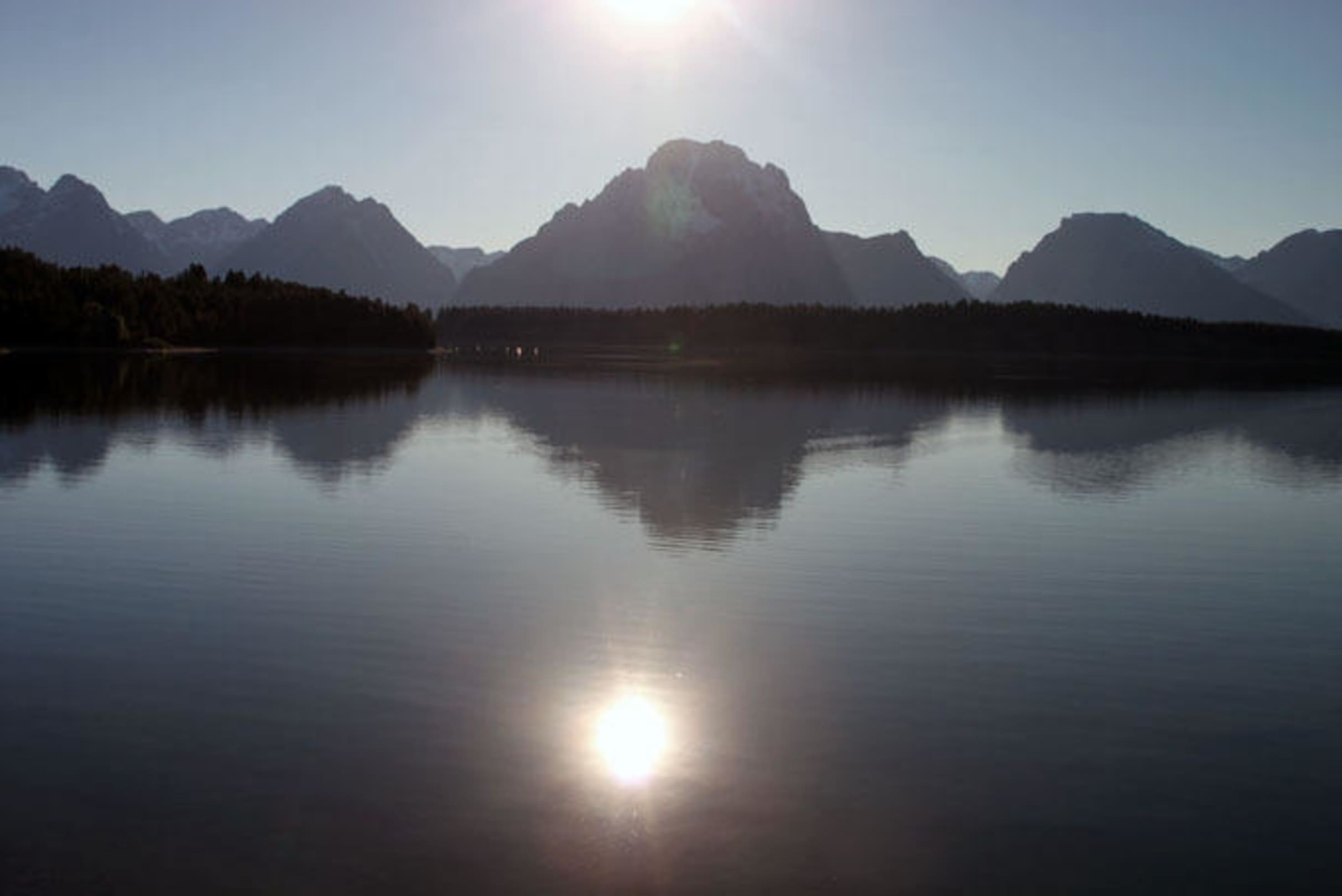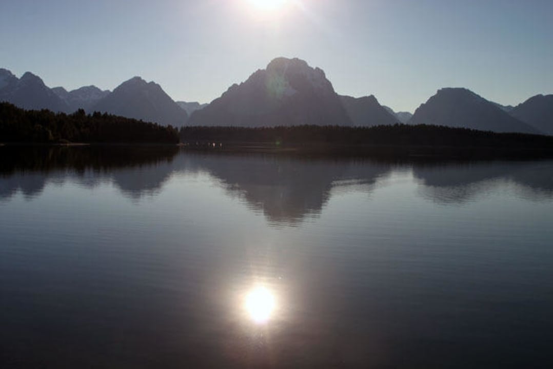 Kurz vor Sonnenuntergangblick vom Ufer des Jackson Lake nördlich von der Lodge auf die Teton Range kurz vor Sonnenuntergang