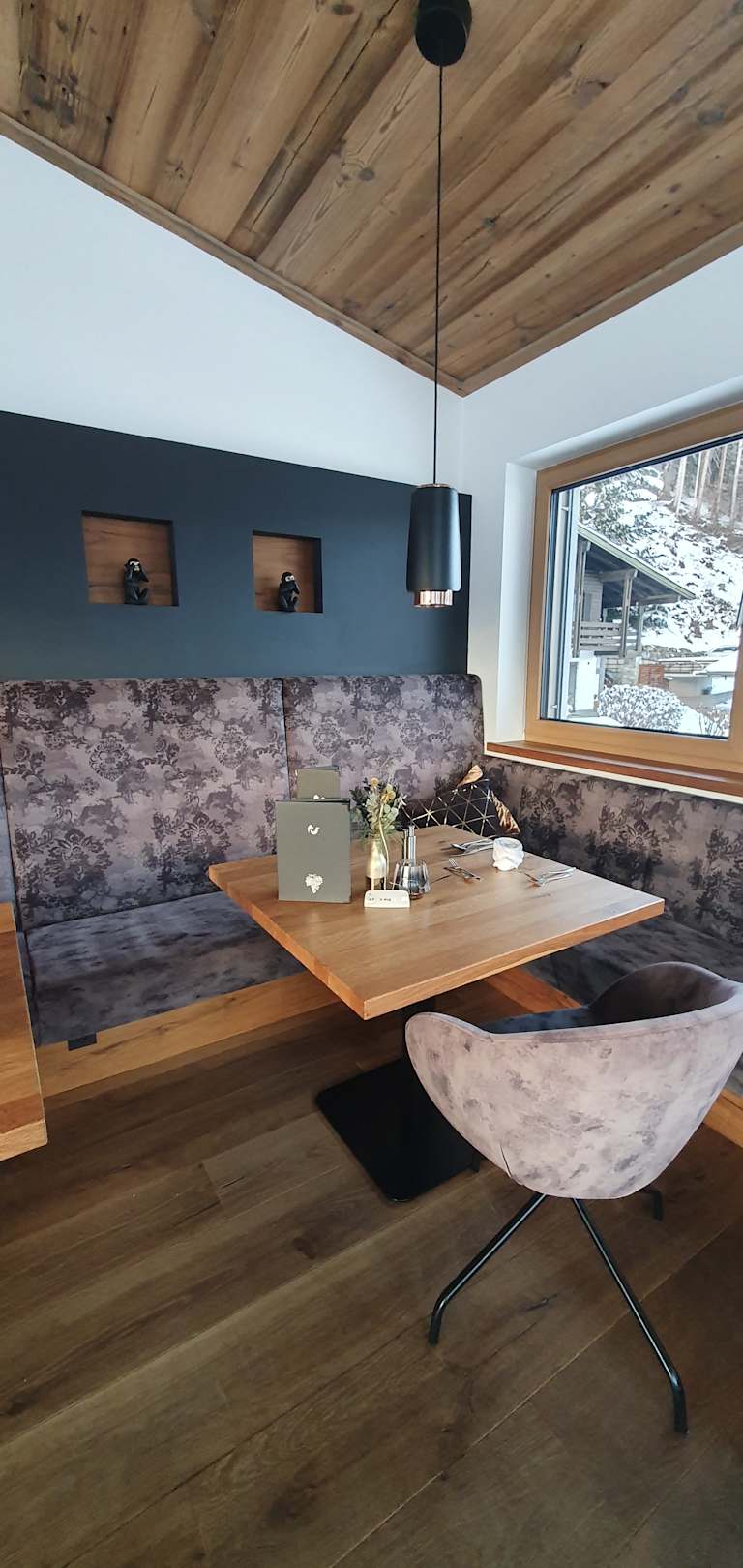 Silberfux: Speiseraum, sehr geschmackvoll eingerichtet, mit schönem Ausblick