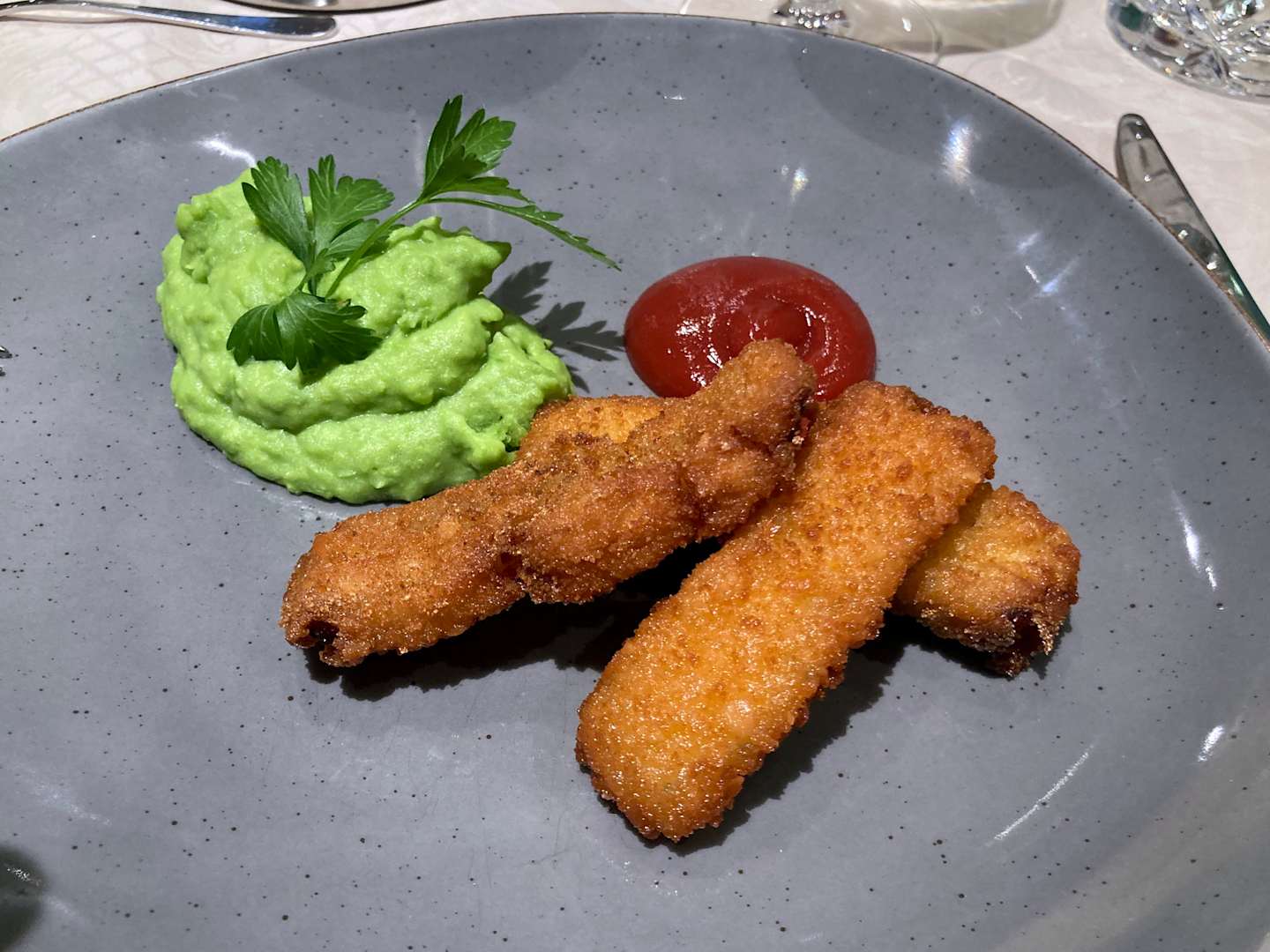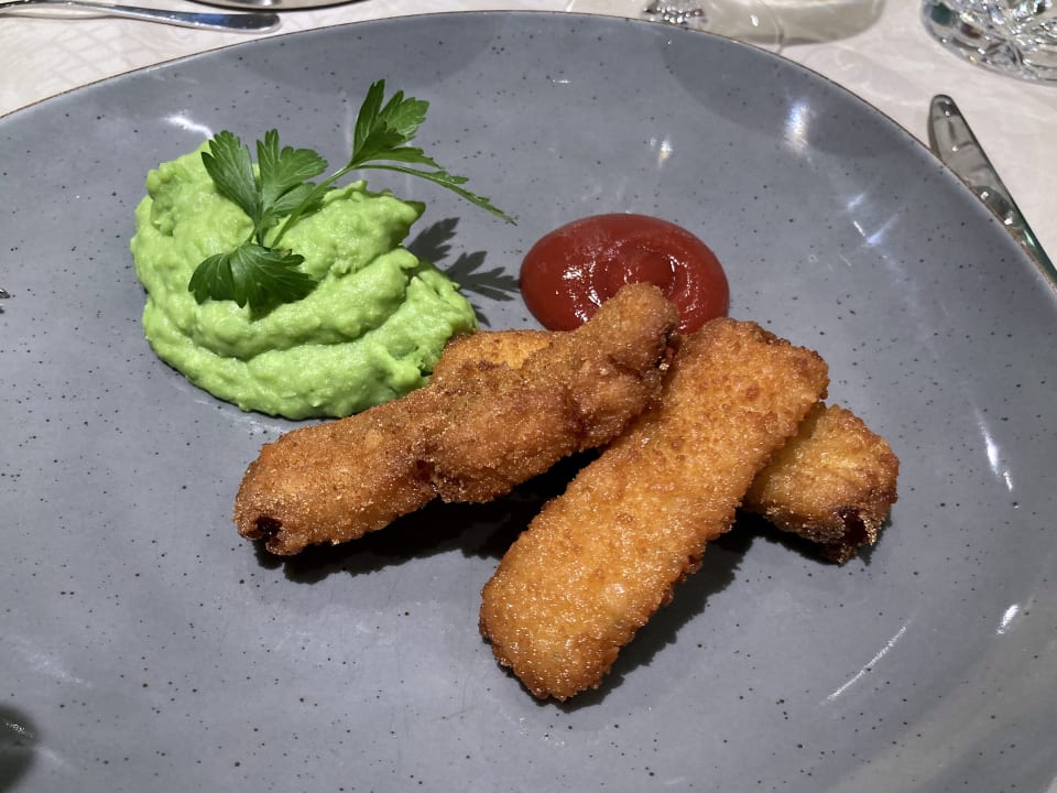 Kinderessen als Kinderportion. Selbstgemachte (!) Fischstäbchen und Erbenspüree mit Biß.