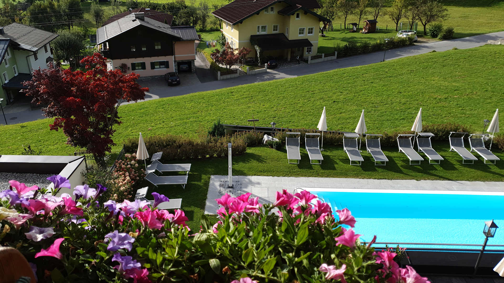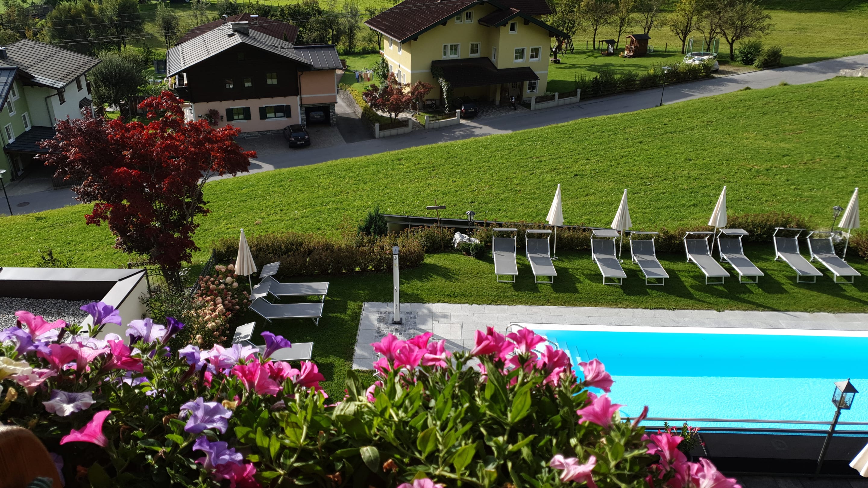 Blick vom Balkon auf Pool und Umgebung