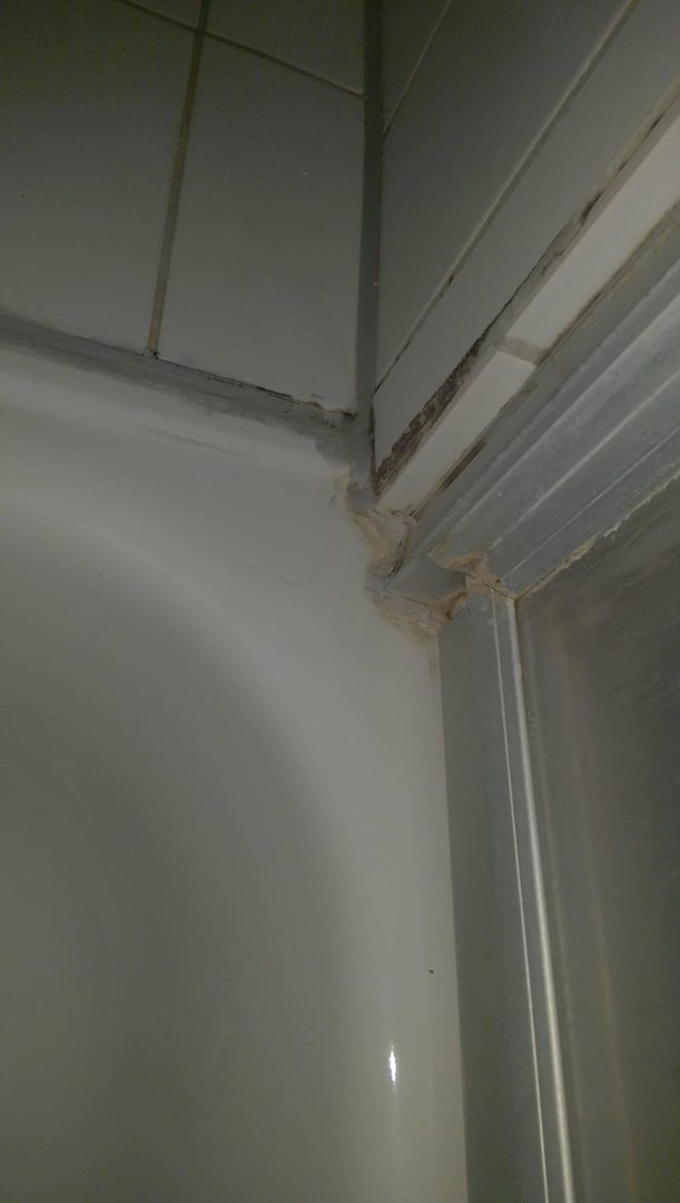 Kleines Duschbad, Schimmel und Kalkverkrustungen. Auch sonst leider nicht sauber.