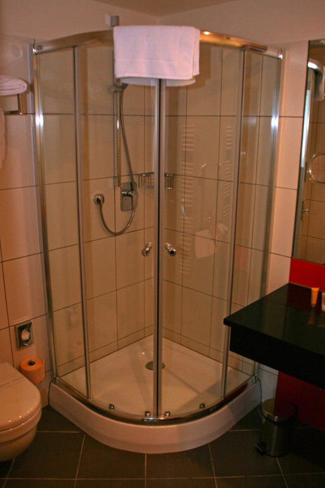Im geräumigen Bad stand die Dusche in der Ecke gegenüber der Tür