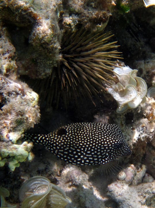 Sternen-Kugelfisch und farbiger Seeigel