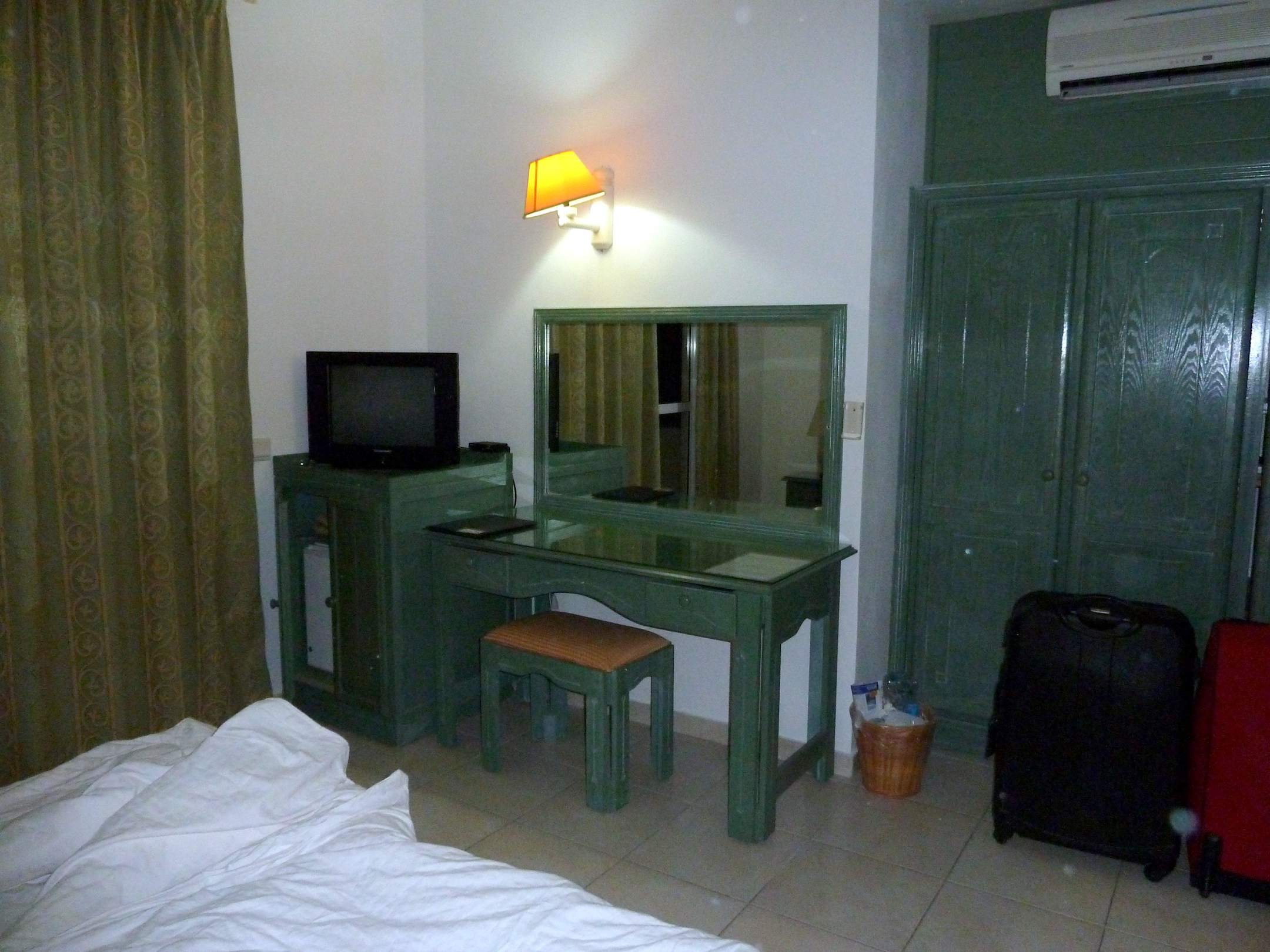 Kleiner Schreibtisch mit TV und Kühlschrank